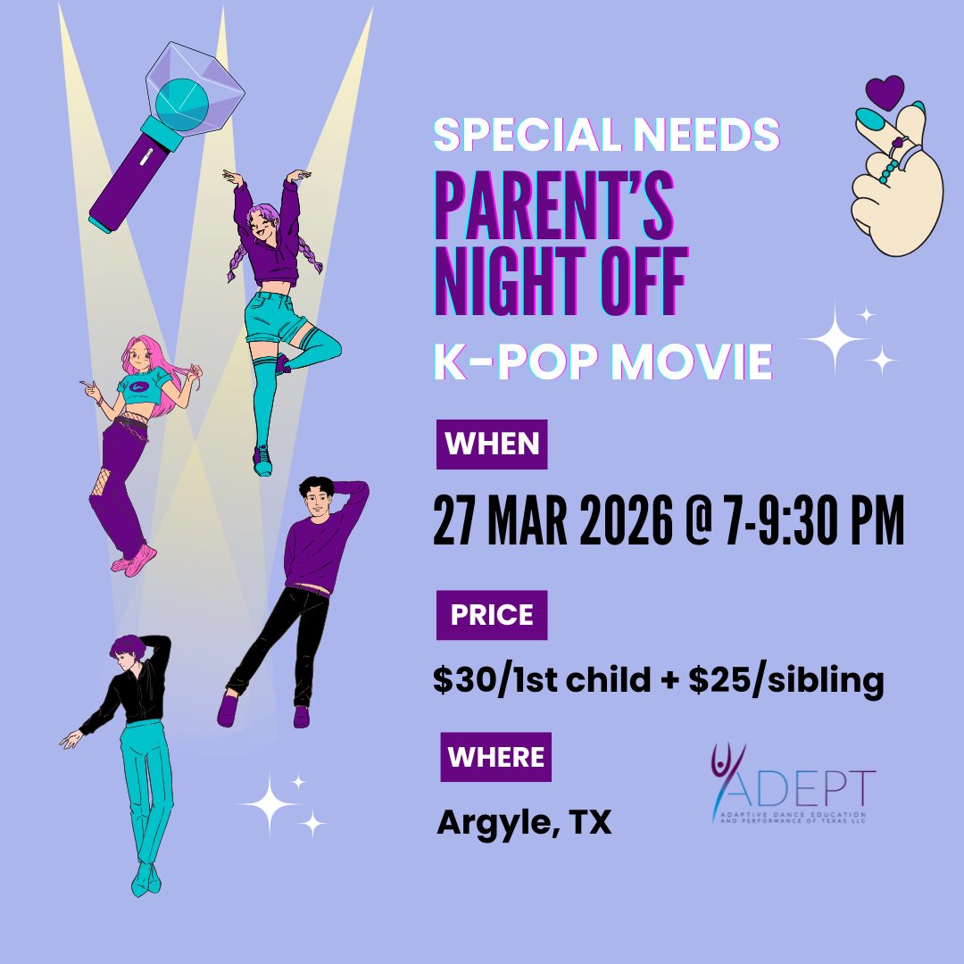 Join us at ADEPT Adaptive Dance for a high-energy, heart-filled K-Pop Movie Night designed especially for children of all abilities. This is a fun evening where kids can relax, connect, and enjoy a themed movie experience in a supportive, inclusive environment.